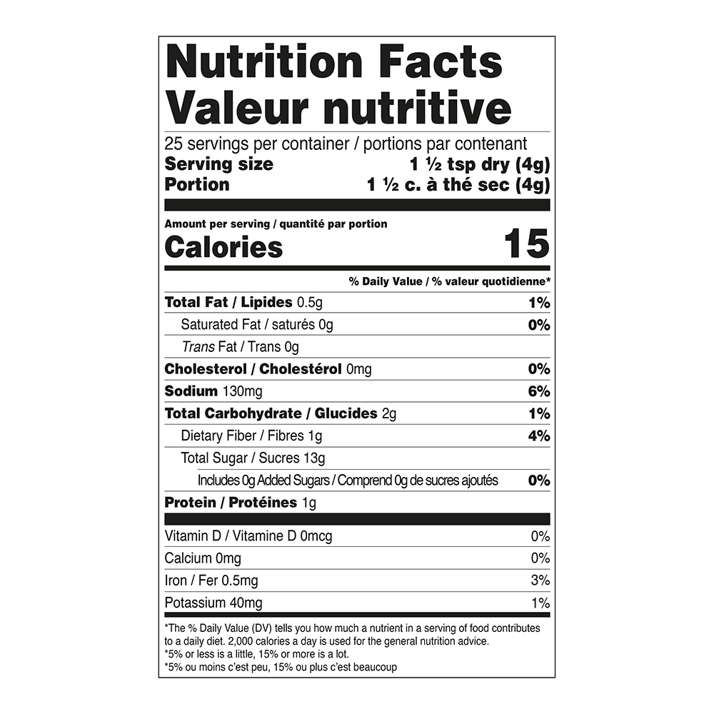 Cracked black peppercorns, whole mustard seeds, flakes of onion and garlic, one of our original classic recipes. It is also delicious on juicy Portobello mushrooms, tofu or seitan. Large format, new packaging of our best selling seasonings. The blends your customers know and love, now in a recyclable card container with reclosable lid. The canisters are aluminium foil lined to provide a long shelf life for the seasonings which also come in a sealed protective pouch for double protection against moisture. Canister Dimensions: 11 cm H x 8.3 cm D